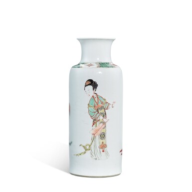 Deze slanke vaas is versierd met een verfijnde voorstelling van een hofdame in traditionele klederdracht, omringd door een subtiel bloemendesign. De fijne penseelstreken, de charme van de vrouwelijke pose en de delicate kleuren getuigen van de verfijning van het famille verte porselein. De hals is versierd met een decoratieve band die de compositie harmonisch completeert.