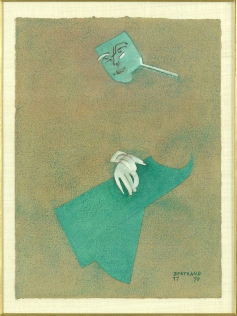 Dit intrigerend hedendaags kunstwerk, gesigneerd door Bertrand en gedateerd 1977-1990, onderscheidt zich door zijn evocatief minimalisme en subtiel symbolistische esthetiek. De kunstenaar beheerst het evenwicht tussen abstractie en figuratie, wat resulteert in een delicate en introspectieve visuele dialoog.