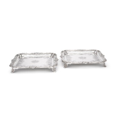 Deze vierkante dienbladen met afgeronde hoeken zijn versierd met geciseleerde randen van acanthusbladeren en rocaille krullen, typerend voor de decoratieve stijl van het begin van de 19de eeuw. Het centrum is gegraveerd met het wapenschild van John Walter (1776-1824). Elk stuk rust op vier gegoten voeten met blad- en krulmotieven, wat het geheel een grote grandeur verleent.
