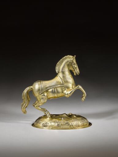 Zeldzame vergulde zilveren beker in de vorm van een steigerend paard, werk van zilversmid Christoph Müller te Breslau omstreeks 1700.