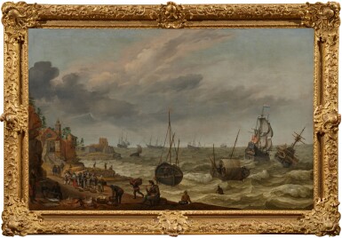 Groot Hollands zeegezicht uit de 17de eeuw door Abraham Willaerts, met storm, visserij en een levendige aanlegsteiger. ...