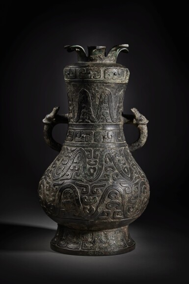 Krachtige archaïsche rituele 'Hu' bronzen vaas, met geciseleerd geometrisch decor en kroondeksel, daterend uit het einde...